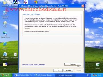 | Passo 4: Per eseguire MGADiad.exe (per verificare che la copia è diventata genuina) cliccare Continue | Fine: Controllare Validation Status, nell aprima riga in alto. Se indica Genuine la copia di Windows Xp è regolarmente valida e non avrete mai più il problema WGA. | |