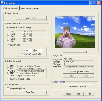 | La chicca Pixresizer, totalmente gratuita, permette di scegliere vari metodi, tra cui uno automatico che sceglierà il migliore compromesso fra formato e dimensione. Sono inoltre presenti funzioni quali la conversione tra i formati più diffusi ( JPEG, GIF, BMP, PNG e TIFF ), rotazione, conversione in scala di grigio… Il programma si presenta con due schede (Tab). Da segnalare è il fatto che funziona molto bene anche con Windows Vista, anche se tra i sistemi operativi non è segnalato. | ||
