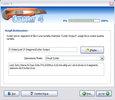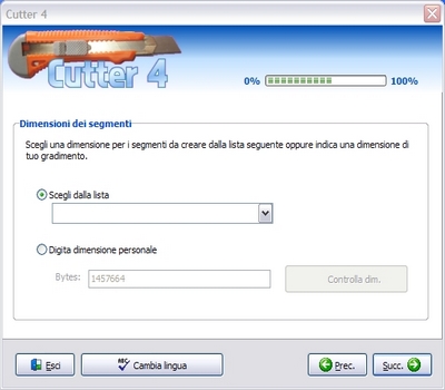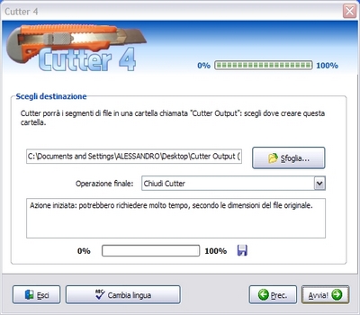 | Quante volte ci è capitato di avere un file troppo grande da spedire via e-mail ai nostri amici? Magari abbiamo appena fatto un video da 600 Mb e lo vogliamo condividere con i nostri parenti su un sito di file hosting? Il problema in questi casi è che file troppo grossi non vengono accetati per superamento delle dimensioni massime consentite, e allora come fare? Semplice, basta utilizzare una chicca di nome Cutter4 che risolverà tutti i nostri problemi! | ||