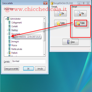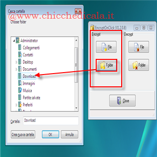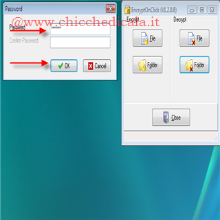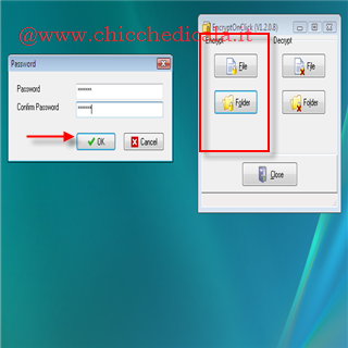 | Criptare una cartella o un file: è semplicissimo. Basta avviare il programma e \t\tdalla parte sinistra della finestra cliccare File per proteggere con password un solo file. Oppure cliccare Folder per criptare \t\ttutti i file all’interno della cartella . Ora non dobbiamo fare altro che scegliere il file o cartella e cliccare OK | Criptare una cartella o un file: Dopo aver scelto il file o la cartella da proteggere con \t\tuna password, non dobbiamo fare altro che scegliere una bella password per proteggere i nostri dati e metterli al riparo da occhi indiscreti. \t\tLa password va inserirla due volte e poi bisogna cliccare OK | |