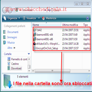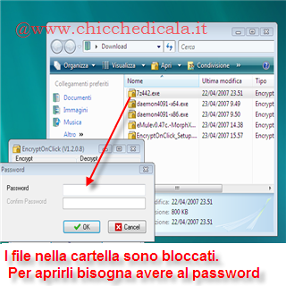 | Come si presenta la cartella con il file bloccati? In figura è mostrato come si presenta la cartella protetta dalla password. Tutti i file sono \t\tbloccati, questo vuol dire che per aprirli è necessario disporre della password impostata precedentemente. | Decriptare \t\tuna cartella o un file? Questo è il procedimento inverso a quello \t\tfatto precedentemente. Basta avviare il programma e dalla parte destra \t\tdella finestra cliccare File oppure Folder per sbloccare \t\ttutti i file all’interno della cartella . Ora non dobbiamo fare altro \t\tche indicare il file o cartella e cliccare OK. | |
