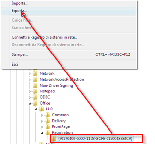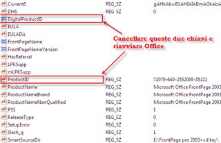 | 1. Salviamo la chiave attuale: Start/Esegui/ REGEDIT, portiamoci nella chiave di registro HKEY_LOCAL_MACHINE/Software/Microsoft/Office/11.0/ Registration/ Cliccare File/Esporta e salvare il registro dove desideriamo. In caso di problemi basta fare un doppio click sul registro. 2. Cancellare il vecchio seriale: Guardiamo sulla colonna di destra relativa alla chiave che abbiamo appena esportato. Cancellare le chiavi DigitlaProductIDe ProductID. Riavvia Office 2003 e ti verrà chiesto di inserire il nuovo seriale | |||||||||||