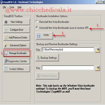 | Portiamoci sul Pannello \t\tdi controllo, andiamo in Strumenti di amministrazione e nella \t\tcolonna di sinistra clicchiamo Gestione Disco. Fatto ciò \t\tcompariranno sulla destra tutte la partizioni di tutti i dischi \t\tinstallati. Individuiamo la partizione di Windows Vista e con il \t\ttasto destro sopra di questa scegliamo \t\tFormatta. | Ora scarichiamo EasyBCD da \t\t \t\tqui, installiamolo e avviamolo. Dalla finestra principale del \t\tprogramma non dovremo fare altro che cliccare Manage Bootloader. \t\tSulla parte di destra clicchiamo Uninstall the Vista Bootloader (use \t\tto restore XP) e successivamente per terminare clicchiamo Write | |