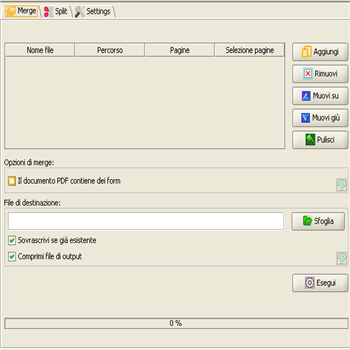 | Merge Per unire diversi file pdf basta cliccare su Aggiungi e caricare tutti i file di cui si desidera effettuare la “fusione”. Con i tasti su e giù possiamo scegliere l’ordine con cui fare la fusione dei file. Il bottone Sfoglia ci consente di scegliere il percorso in cui ritrovare il file pdf creato. |