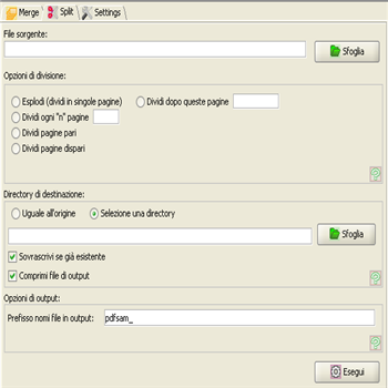 | Magari non sarebbe meglio fonderli -riunirli – fare il merge in un unico file? Già, come si fa? Semplice , si usa una chicca di nome PdfSam, semplice, intuitiva, gratuita, open source. Non solo consente di fondere diversi file , ma permette di fare anche l’opposto, ovvero splittare un file in uno o più pdf. L’interfaccia del programma si presenta con 3 schede principali. Una per fondere diversi file pdf (MERGE), l’altra per dividere un pdf in due o più file(SPLIT) e un altra scheda in cui si possono impostare alcune opzioni per il programma (SETTINGS) | ||