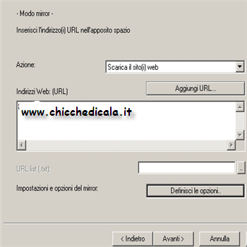 | 3) Indichiamo indirizzo del sito: scriviamo l’indirizzo del sito da copiare, e clicca Avanti, mentre per entrare nelle opzioni avanzate clicca “Definisci le opzioni”. | 4) Fine: clicchiamo il tasto fine per dare il via alla copiatura. | |
