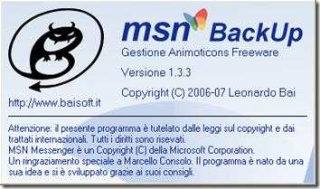 | MSNBackUp è un programma Freeware realizzato dalla BAISOFT di Leonardo Bai(MVP Windows Live, Windows Live Messenger) capace di esportare ed importare il profilo Messenger presente nel nostro computer, esso è utle quando abbiamo la necessità di trasferire il nostro profilo su un altro computer o quando dobbiamo formattare il computer o quando vogliamo fare una copia di sicurezza del proprio profilo, senza perdere l’archivio personale di animoticons, avatar, emoticons, sfondi e immagini raccolte in mesi o anni di chat. Questo programma, a differenza di altri presenti in rete, non installa spyware, trojan né link ad altri siti. MSNBackUp è compatibile con tutte le versioni di Messenger, partendo da Microsoft MSN Messenger 7, 7.5 e Windows Live Messenger 8.0 e 8.1 fino all’ultima versione di Windows Live Messenger 8.5 ed è compatibile con i sistemi operativi Windows 2000, 2003, XP e l’ultimo nato Windows Vista. | ||