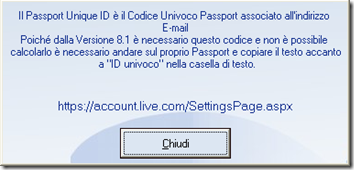 | Passport Unique ID Cliccando sul pulsante “?” sotto al binocolo si apre una finesta che \t\tspiega cosa è il Passport Unique ID e da il link cliccabile per \t\tritrovarlo \t\thttps://account.live.com/SettingsPage.aspx A causa continui cambiamenti nel sito l’impresa è un po difficile, ma di \t\tsolito si trova in “informazioni dell’account” in basso sotto la voce \t\t“ID univoco” | Help del programma Cliccando sul pulsante “?” in basso è possibile vedere l’Help del \t\tprogramma che da informazioni come il sito del produttore, lo \t\tsviluppatore e la versione | |