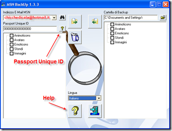 | Avvio del programma Il programma è in italiano e la schermata che si presente all’utente è \t\tunica permettendo di avere sotto controllo tutte le informazioni che \t\tservono per il BackUp | Passport Unique ID Dopo aver inserito il proprio indirizzo di Messenger, se si possiede una versione di Windows Live Messenger successiva alla 8.1 si deve trovare \t\til propio ID | |