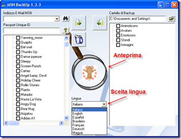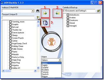 | Specifiche del programma Inserito l’indirizzo del contatto e l’ID univoco, cliccando sul \t\ttasto cerca(binocolo) è possibile visualizzare le Animoticons, Avatar, \t\tEmoticons, Sfondi e Immagini caricati suo proprio profilo, permettendo \t\tdi vedere una anteprima dell’elemento selezionato, e cliccandoci sopra \t\tpermette di vederla in azione, vedendola in movimento, nel caso di \t\tEmoticon, Animoticon e Avatar dinamici. E’ anche possibile cambiare la \t\tlingua del programma scegliendo tra quelle supportate dal menu a tendina | BackUp del profilo Passiamo ora alla parte che ci interessa ovvero al BackUp ed al \t\tripristino del profilo. Partiamo con il BackUp, selezioniamo il profilo \t\te scegliamo, selezionando, i componenti che vogliamo salvare, poi \t\tselezioniamo la “Cartella di BackUp” clicchiamo sul pulsante \t\tevidenziato con “1″, ed il BackUp parte, creando nella “Cartella di \t\tBackUp” una seie di file con estensione MCO che rappresentano i \t\tcomponenti del profilo salvati | |