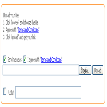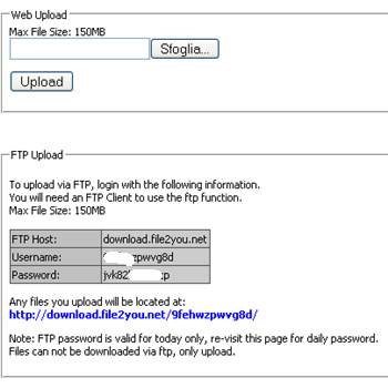 | File2youNessuna registrazione, supporta FTP, 150MB per file, Nessun limite di upload. Nessun limite di download, Multipli File Upload, semplice FTP Uploads, funzione ripristina download! Donwload diretto senza ritardo ne tempo di attesa. | FileHo Nessuna registrazione, supporta FTP, nessun limite di Upload Nessun limite di download, multipli file upload, uploads, funzione ripristina download! Donwload diretto senza ritardo ne tempo di attesa. | |