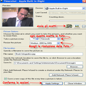 | Timershot consente di fare tutto questo e molto di più. Il programmino estremamente semplice e leggero ci consente di impostare il timer per lo scatto automatico delle foto dalla webcam. Possiamo ad esempio far scattare una foto al secondo, o ogni quanto desiderato. Pensate alla possibilità di fare delle fototessere urgenti, o ancora potremmo per esempio impostare la webcam come dispositivo di sicurezza in casa, registrando uno scatto tot secondi o minuti o ore. Ancora potremmo immortalare la cena dei 18 anni o una romantica scena d’amore. Insomma, gli utilizzi della chicca dipendono dalle necessità e fantasie di ognuno di noi. | ||