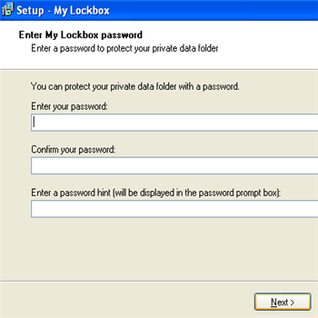| Installazione1: facciamo doppio clic sul file d’installazione \t\tfolderlockbox_setup.exe. Clicchiamo sempre NEXT fino a quando \t\tincontriamo la schermata sopra indicata. Scriviamo nelle prime due righe \t\tla password che ci verrà chiesta ogni volta che vorremo bloccare o \t\tsbloccare una cartella. Nella terza riga scriviamo invece il nome utente \t\ta scelta. | Installazione 2: proseguiamo con l’installazione indicando il percorso \t\tnel quale installare il programma e clicchiamo NEXT. | |