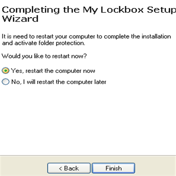 | Riavvio PC: terminata l’installazione ci viene richiesto di \t\triavviare il PC per rendere il programma funzionante. Clicchiamo Finish \t\tper riavviare e poter usare la chicca. | Avviamo il programma: Start/Programmi/My LockBox. \t\tCi viene richiesta la password inserita in fase di installazione. | |