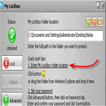 | Scegliamo la cartella da nascondere: dalla schermata \t\tvisualizzata in figura, scegliamo la cartella da rendere invisibile e \t\tclicchiamo OK . Quindi, cliccare Lock e a questo punto la cartella non sarà più \t\tvisualizzabile e nessuno potrà accedergli, a meno che questi non acceda al \t\tprogramma e sia in possesso della password di sblocco. | Sbloccare la cartella invisibile: ok , ora siamo al \t\tsicuro, nessuno ci spia e possiamo fa resuscitare la nostra cartella. \t\tBasta riaprire il programma, indicare il percorso della cartella (My \t\tLockbox folder location) e cliccare su Unlock. | |