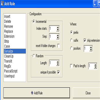 | Case: questa regola consente ad esempio di trasformare tutti i nomi dei file in maiuscolo (All Upper Case) o di invertire le lettere di ogni nome , ad esempio da “casa” a “asac” (Invert Case). Possiamo trasformare tutto in minuscolo (all lower case) e altre funzioni che vi lascio come compitino per casa. | Serialize: è una delle regole più importanti che serve per assegnare ad ogni foto un numero che può essere incrementale (foto1 foto 2…foto n) oppure casuale (Random). Ovviamente possiamo scegliere se assegnare questi numeri prima di ogni nome (prefix) oppure alla fine del nome di ogni file (suffix) | |