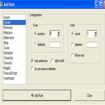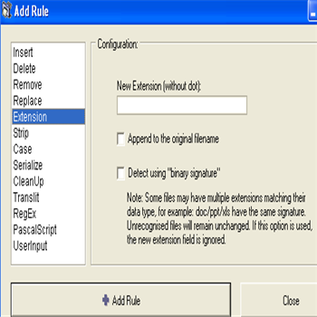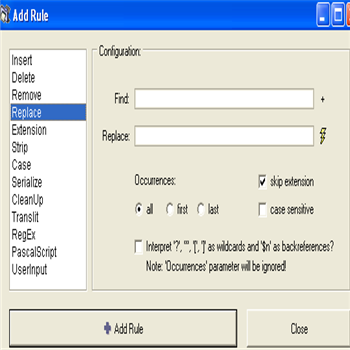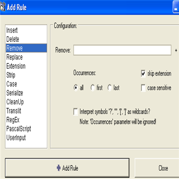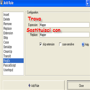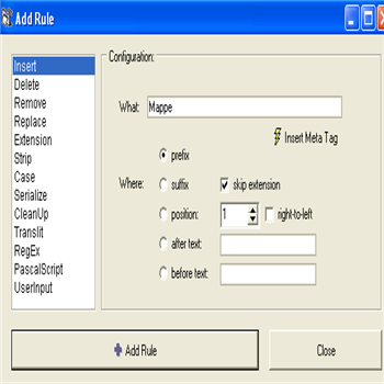 | Caricare un file o una cartella di files: basta cliccare F3 per rinominare un solo file, oppure F4 per caricare l’intera cartella dei file che desideriamo rinominare. Clicchiamo successivamente sul bottone Add Rule. | Insert consente di aggiungere una parola prima(prefix) dopo (Suffix) dopo un certo numero di caratteri (position), dopo una certa stringa (after text) o prima (before text) | |