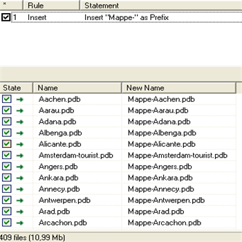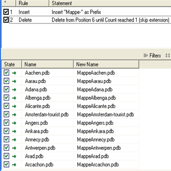 | Risultati di Insert (prefix): come vedete a sinistra c’è il nome originale dei files, mentre a destra viene visualizzata l’anteprima delle modifiche. Io nell’esempio ho inserito la parola “Mappe-” ed ecco in figura il risultato. | Delete: questa regola permette di cancellare dal nome originale del file un certo numero di caratteri a partire dalla posizione “6″ (From) “1″ solo carattere (Until). Non abbiate paura di sperimentare, provate ogni regola, poi vedendo l’anteprima capirete come effettivamente va usata la regola in questione. | |