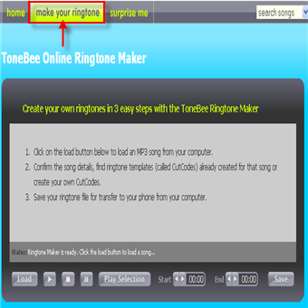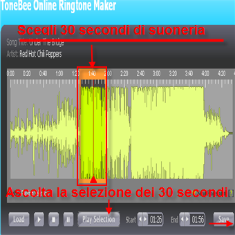 | Per prima cosa occorre \t\tregistrarsi gratuitamente sul sito ufficiale (link a fine guida) ed \t\teffettuare il login. | Clicca su make your \t\tringtone, e si apre una schermata dalla quale devi cliccare Load \t\tper caricare il file Mp3 da cui vuoi estrarre la suoneria. | |