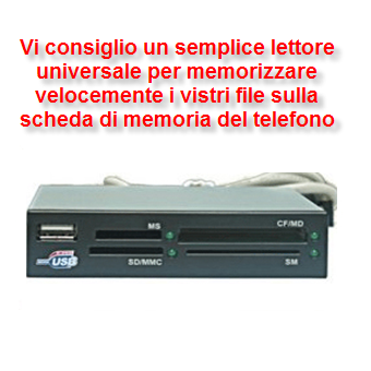 | Una volta caricata la \t\tcanzone potrai scegliere in nomo immediato i migliori 30 secondi della \t\tcanzone muovendo il rettangolo a tuo piacimento, ascoltando anche \t\tl’anteprima della suoneria (Play Selection). Quando siamo sicuri \t\tdi tutto clicchiamo Save per estrarre la suoneria dal file mp3 e \t\tsalvarla nella memoria del telefono. | Inserire la suoneria nella \t\tscheda di memoria del telefono. Non tutti sanno che esistono in \t\tcommercio dei comodi ed economici lettori di memorie per \t\ttelefoni-smartphone. Ad esempio, nel lettore indicato in immagine potete \t\tinseire Cf/MD, SD, MMC, MS. Basta inserire la memoria nel lettore \t\tconnesso tramite il cavo Usb, ed in un click trascinate comodamente i \t\tvostri file all’interno. | |