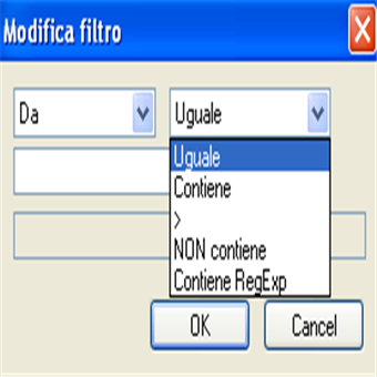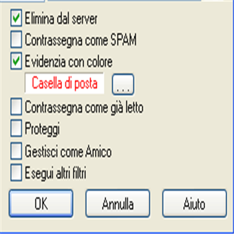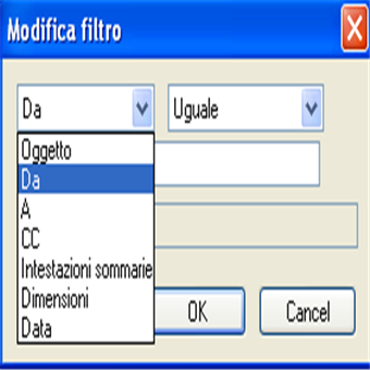 | Condizioni del filtro sul mittente Identifica qual è il campo su cui sarà effettuato il controllo:Oggetto: scrivere l’oggetto dell’email sulla quale si vuole applicare un filtro Da: scrivere qui l’indirizzo email del mittente A CC Intestazioni Dimensioni Data | Condizioni del filtro sul campo Questa opzione controlla quando il filtro deve essere applicato. Valori possibili: Uguale: il campo deve essere esattamente uguale al testo indicato. In alternativa può essere usato « * » quale metacarattere. Es. *@mail.com Contiene: il campo deve contenere il testo indicato Contiene RegExp: il campo deve contenere un riscontro per mezzo di RegExp Non contiene: il campo NON deve contenere il testo indicato >: questo operatore può essere usato soltanto con il campo Dimensione; il filtro sarà applicato se il formato del messaggio è più grande di quanto indicato nella casellina, in byte.I confronti di testo non sono influenzati dai caratteri in Maiuscolo/minuscolo. | |