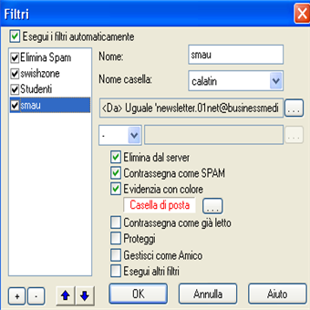 | Salviamo la configurazione creata: ricordiamoci di salvare la configurazione degli account appena creati andando in File/Salva. I programma salverà tutto in un file che memorizzerà dentro la cartella del programma. In tal modo potremo copiarci la cartella in una pen-drive. | Impostare un filtro: Questa è l’operazione più importante in quanto da qui decideremo cosa visualizzare in futuro, quali email eliminare, in modo rapido e potente. Basta portarsi su File/Filtri e aggiungere un nuovo filtro alla volta cliccando il tasto +. Segue un ampia carrellata sui filtri… | |