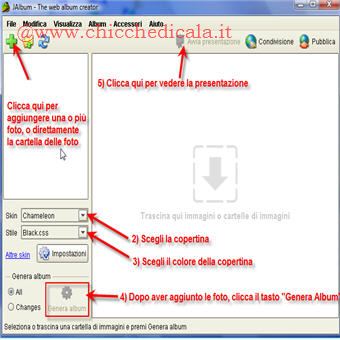 | Facile da usare: il funzionamento è estremamente semplice, bisogna solo aggiungere la cartella delle foto , o solo singole foto. Dopo di che di sceglie la copertina, il colore della stessa, e si crea l’album cliccando su Genera Album. | ||