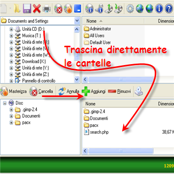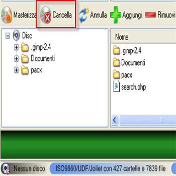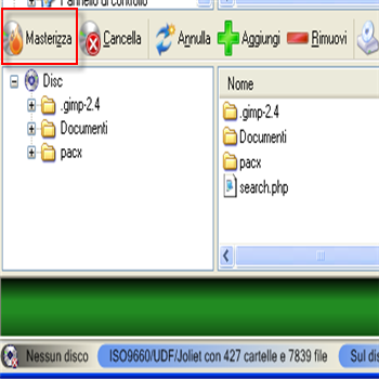 | Cliccare “Masteriiza” per finalizzare la materizzazione | “Cancella” serve per cancellare i dati da un cd-dvd riscrivibile. | |