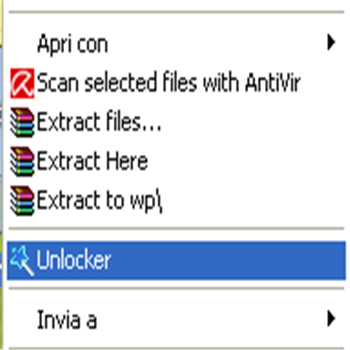 | Eliminare il file bloccato: basta cliccare con il tasto destro sul file che non si cancella. Clicchiamo dunque Unlocker. | Eliminare il file bloccato 2: a questo punto dal menù a tendina clicchiamo Elimina | |