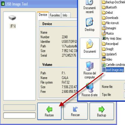 | Backup: basta semplicemente avviare il programma, selezionare la periferica desiderata, e cliccare il bottone Backup. | Ripristinare l’immagine: questa operazione consente di ripristinare la pen-drive o il disco esterno con l’immagine salvata precedentemente. | |