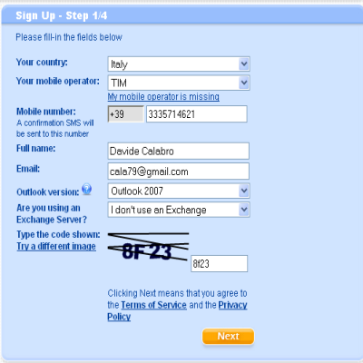 | In questa pagina non dovremo fare altro che completare i dati indicando il nostro operatore, numero di cellulare, nome , email, versione di Outlook e codice di sicurezza. | Completata la fase precedente, il sito ci invierà un sms gratuito. In questo messaggio di testo è presente la password che dovremo indicare nell’apposita casella e cliccare Next | |
