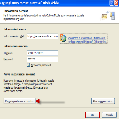 | Confermare cliccando SI. | Cliccare su Prova impostazioni account, altrimenti procedere con OK. | |