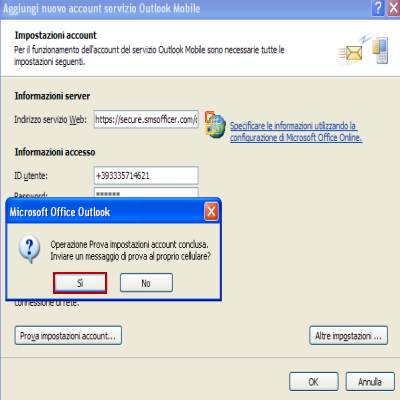 | Se si è scelto di provare a mandare un messaggio di prova, in questo step dovremo confermare con SI. | A questo punto Outlook è pronto per inviare SMS. Basta cliccare su Nuovo / SMS. | |