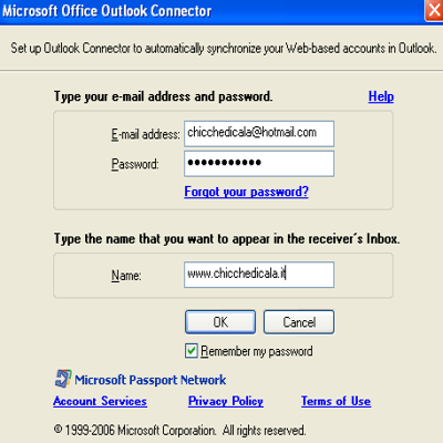 | Dopo aver installato il componente aggiuntivo, all’apertura di Microsoft Outlook, viene visualizzata una finestra dove andremo ad inserire nome utente, password, e un nome (indicativo) della webmail, ad esempio Hotmail. | Una volta impostati questi semplici parametri di connessione non dovremo fare altro che dare l’OK e attendere che Outlook ci dia la conferma della corretta attivazione della webmail sul client di posta, ci possono volere anche alcuni minuti. | |