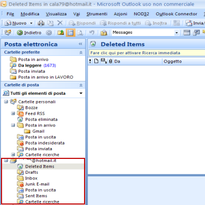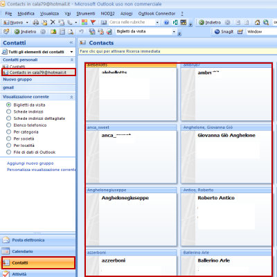 | Ecco quindi comparire sul lato sinistro la nostra nuova casella di posta elettronica di Hotmail dalla quale potremo cosi inviare e ricevere email direttamente su Outlook. | Altra cosa ovvia, ma è sempre bene sottolinealro, è la possibilità di gestire tutti i contatti di hotmail e quindi di Windows Live Messeger per chi associa l’account solo alla funzione di messaggistica. | |