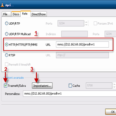 | Apri flusso di rete: cliccare “Ctrl R” oppure dal menu “File” scegliere “Apri flussi di rete”. | Impostare la registrazione del canale: spuntiamo il flusso “http/https/ftp/mms” come in figura (1) , e scriviamo in URL il link del canale da registrare. Spuntiamo “Trasmetti/Salva” (2) e clicchiamo su “Impostazioni”. | |