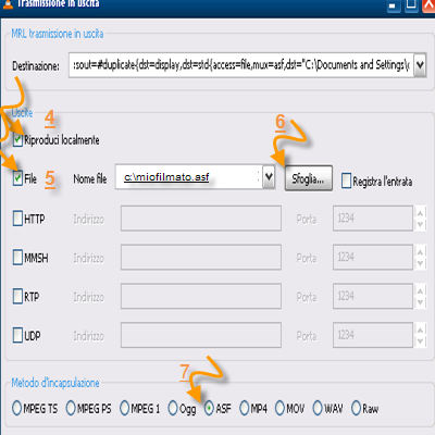 | Impostare la registrazione del canale:spuntiamo “Riproduci localmente” (4), spuntiamo “File” e (5) da “Sfoglia” (6) indichiamo il percorso dando il nome del nostro filmato finale, ad esempio miofilmato.asf. Infine, clicchiamo come “metodo di incapsulazione” ASF (7). Quest’ultimo è il metodo testato da me, ma nulla vieta di usarne altri. | Quali canali posso registrare? Si possono registrare tutti i flussi o canali di cui siete a conoscenza, sopra ne trovate alcuni come Rai 1, Rai 2, Rai 3, Rai News, Rai Sport, deejay TV, All Music, RTL 102.5. Radio Italia TV. Canale 7, Repubblica TG, Repubblica TV, Telerama, Ibiza ON, Carpe Diem, CBL Film… | |