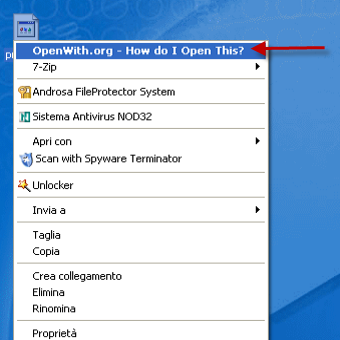| Dopo avere scaricato ed installato OpenWith.org Desktop Tool, clicchiamo con il tasto destro del mouse il file sconosciuto e scegliamo la prima voce del menu, OpenWith.org – How do I Open This?“ | Ecco cosa appare…Un facile menu che ci descrive di che file si tratta, e con quali applicazioni possiamo aprirlo. Per ultimo ci consente anche di scaricare il relativo programma in modo semplice e immediato. | |