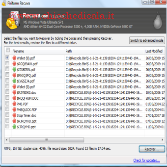 | Ecco che ha trovato tutti i file del tipo che abbiamo selezionato precedentemente. Selezioniamo quello che più ci interessa. | Clicchiamo su Recover , scegliamo la destinazione e finito. | |