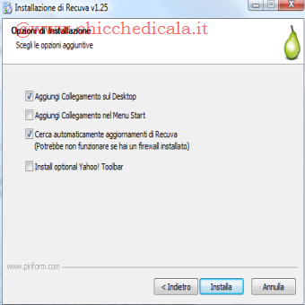 | Clicchiamo ancora su “AVANTI” Possiamo lasciare il collegamento sul desktop e “cerca automaticamente aggiornamenti” ma vi consiglio di eliminare le altre voci, sopratutto l’ultima. | Finiamo l’installazione cliccando su “INSTALLA” e successivamente “FINE” | |