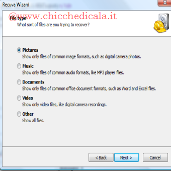 | Facciamo partire il programma e clicchiamo su “NEXT” | Scegliamo la tipologia del nostro file cancellato ( Immagini, Musica, Documenti, Video, Altro) e clicchiamo “NEXT” | |