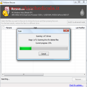 | Qui scegliamo dov’era il nostro file ( Non sono sicuro, Sull’Ipod, Nei Documenti, nel Cestino, In una specifiza locazione del disco) clicchiamo su “START” | Ecco che cerca il nostro file | |