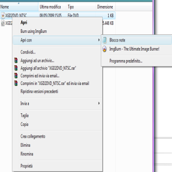 | Innanzitutto vediamo che il nostro gioco ha due file una .iso e un .dvd a noi interessa .dvd ed è qui che andremo ad operare. | Clicchiamo con il destro sul file .dvd e facciamo “Apri con ” e scegliamo il blocco notes | |