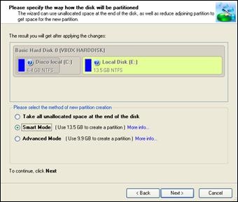 | 3.Avviamo il software e clicchiamo su create Partition. In una delle schermate successive ci verrà chiesto se utilizzare il metodo Smart o Advanced, che differiscono sulle dimensioni della nuova partizione e sull’utilizzo dello spazio. 4. Per agire sulle dimensioni di una partizione creata in precedenza, clicchiamo sul pulsante Resize Partition. Selezioniamo la partizione a sinistra per operare su quella adiacente e scegliamo le dimensioni trascinando il cursore. | ||