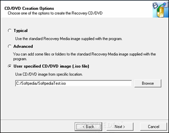 | 5. Per creare un disco di ripristino clicchiamo su Build Recovery Media, selezioniamo CD/DVD e Tipical nella schermata successiva. Segliamo il nostro masterizzatore, inseriamo un disco e completiamo il processo seguendo le istruzioni. 6. Per creare un file d’ immagine in formato ISO, clicchiamo su Build Recovery Media e scegliamo User Specified CD/DVD image. Selezioniamo quindi il file bootcd.iso all’interno della cartella d’installazione del software e quindi Emulator. | ||