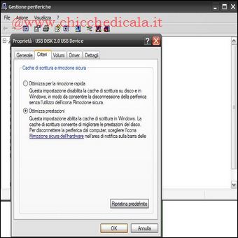 | 1. Andiamo in Start/esegui e digitiamo il comendo devmgmt.msc Clicchiamo sull’icona + accanto la voce Unità disco per far comparire le periferiche di memoria collegate al PC. Infine, col tasto destro clicchiamo sulla pendrive che vogliamo formattare in NTFS e selezioniamo Proprietà. 2. Dalla finestra delle proprietà della pendrive spostiamoci nel tab Criteri. Selezioniamo la voce Ottimizza prestazioni e clicchiamo su OK per confermare le modifiche. La memoria viene scollegata e ricollegata al computer in pochissimi istanti. Chiudiamo tutte le finestre e andiamo in Start/risorse del Computer o computer. | ||