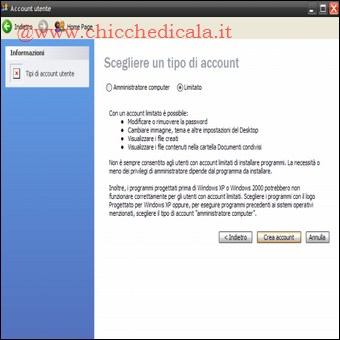 | 1. Un nuovo account: La prima cosa da fare è creare un nuovo account. Clicchiamo su Start/Impostazioni/Pannello di Controllo, poi su Account utente, Crea nuovo account. | 2. limitato si può: Inseriamo nella casella di testo il nome utente, ad esempio Matrix, e clicchiamo su Avanti. Selezioniamo l’opzione Limitato e,per finire, premiamo Crea account. | |
