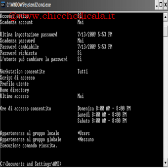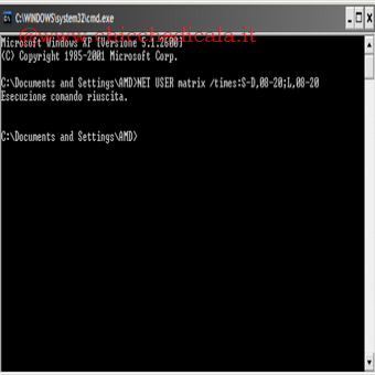 | 3. Ora le restrizioni: Impostiamo le fasce orarie ed i giorni in cui consentire l’accesso all’account creato. Clicchiamo su Start/Esegui, digitiamo cmd e premiamo Invio. Per inibire l’accesso al nostro utente nel weekend ed il lunedì,dalle ore 08:00 alle 20:00, digitiamo NET USER Matrix /Times:S D,08-20;L,08-20 e diamo Invio. | 4. Visualizzare i dettagli: Clicchiamo su Start/Esegui, digitiamo cmd e scriviamo NET USER Matrix e diamo Invio. La voce Ore di accesso consentito riporta i dettagli delle fasce orarie. Per ripristinare tutto digitiamo NET USER Matrix/Times:all e diamo Invio. Per utilizzare gli altri giorni della settimana possiamo servirci delle abbreviazioni L, M,Me,G,V,S,D. | |