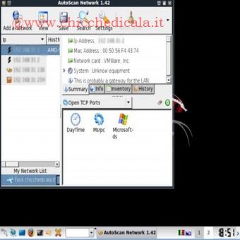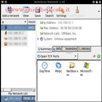 | Vediamo insieme le principale caratteristiche di autoscan: scansione della rete in multi-thread, esplorazione automatica della rete,utilizzo di user “agents”,supervisione dei dispositivi (router, server, firewall), supervisione dei servizi di rete (smtp, http, pop) riconoscimento automatico dei vari dispositivi, riconoscimento di varie intrusioni nella rete,esplorazione del file sharing, client telnet, client nessus, funzione “wake on” su lan. | ||