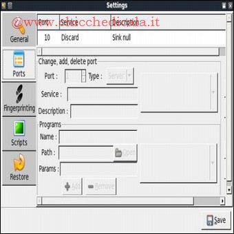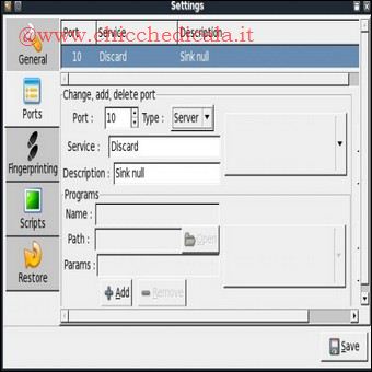 | 11. Volendo se abbiamo esigenze particolari, possiamo configurare il software per fargli eseguire una ricerca più approfondita. Clicchiamo sul pulsante Settings e, nella relativa schermata, spostiamoci nella sezione Ports. 12. Clicchiamo su Add o sulla voce corrispondente in alto e indichiamo il numero di porta da verificare. Indichiamo in Service il nome del servizio che si trova in ascolto sulla porta aggiunta, forniamone una breve descrizione nel campo di testo Description e clicchiamo su Save. | ||